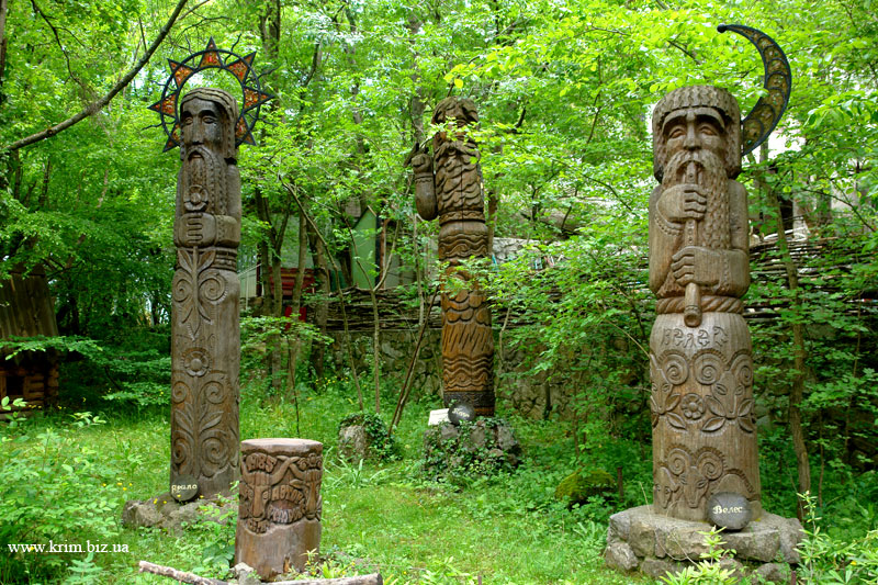 А вот замшелые резные ставни, стильный деревянный идол (солнечные часы? элемент детской площадки? кормушка для птиц? просто скульптура?),использование глиняных черепков в качестве декоративной отсыпки, оригинальный дровник, резная пергола (в качестве украшения хорошо подойдет хмель или актинидия) вполне могут быть. Главное использовать их дозированно.