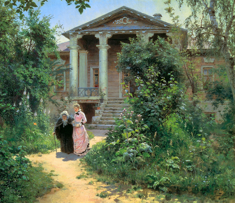 Стиль тонкой, романтичной, немного наивной и слегка грустной интеллигентности, где сильны противоречия между тягой к корням («хождения в народ») и стремлением к прогрессивной Европе. Поэтому усадебный дом может быть украшен резными ставнями, а розарий соседствовать с плодовым садом. В ассортименте растений много белого цвета: чубушник, гортензия, белые сорта сирени, калина «бульденеж», белые розы, лилии, клематисы… В отличии от классического английского сада русский сад более небрежный, все-таки русская душа больше склонна к философии, чем к регулярным садовым работам.